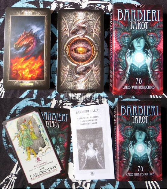 Mam słabość do mrocznej fantastyki, jednak o ile okładka pudełka do tych kart długo mnie nie przyciągała, to intuicja tak. Dzięki recenzjom na YouTube przeglądnęłam wreszcie poszczególne karty i muszę powiedzieć, że wciągnęłam się na 50%. Za decyzją stał jeszcze jeden mocny argument - w Barbieri Tarot występują liczne smoki. Jako Drakonia ze smoczymi powiązaniami, zastanawiałam się jakiego 'gadziego' tarota kupić, żeby jednak posiadać do pracy i zabawy coś tematycznego. Talie, jakie znalazłam w internecie były albo nieciekawe (Dragon Tarot Pracownika, Draconis D. Corsi), albo zbyt epickie (Gothic A. Stokes, Alchemy, Celtic Dragon), albo w końcu udane (no, minus estetyka podpisów kart!), ale dosyć drogie (Dragon Tarot N. Suckling), lub też bardzo fajne, ale niestety nakład został wyczerpany i przez to są sprzedawane po cenach jak dla bogatych kolekcjonerów (Dragons Tarot M. Toraldo wersje mini i standard).