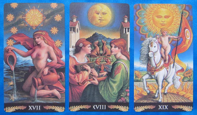 Kosmos i astrologia (karty przypisane Wodnikom, Rybom/Rakom i Lwom). Strasznie mi się podoba rozszczepione światło wokół Słońca i słonecznik-mutant, na którym stoi koń: